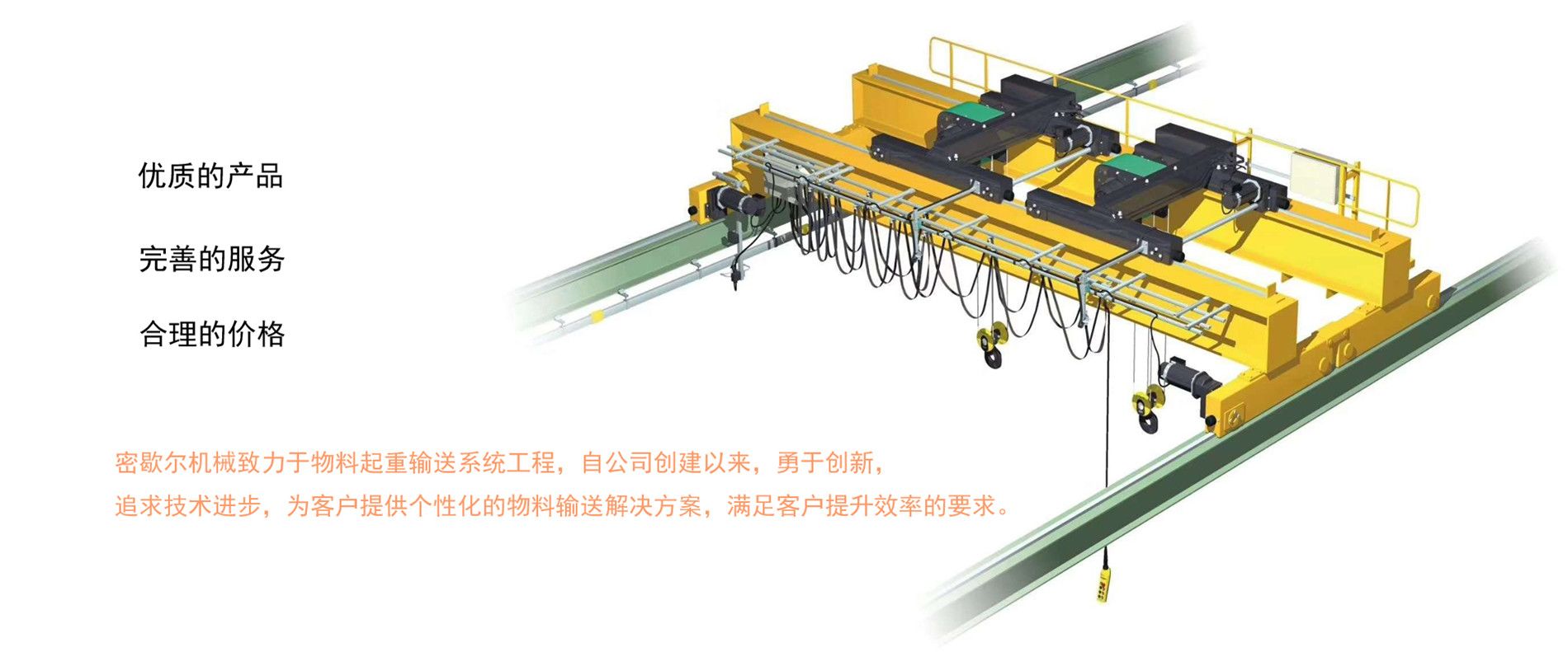 密歇爾起重機械(杭州)有限公司提供全面的起重輸送產品和服務,產品覆蓋環鏈電動葫蘆(125Kg-80T),歐式鋼絲繩葫蘆,防爆葫蘆,懸臂吊,KBK柔性起重機,歐式起重機,起重馬達,端梁,起重移動供電系統等,在國內外被廣泛的應用于生產車間,汽車,模具,機械制造,鐵路,船舶,物流搬運,現代化工廠流水線等工業及其它特殊用途。